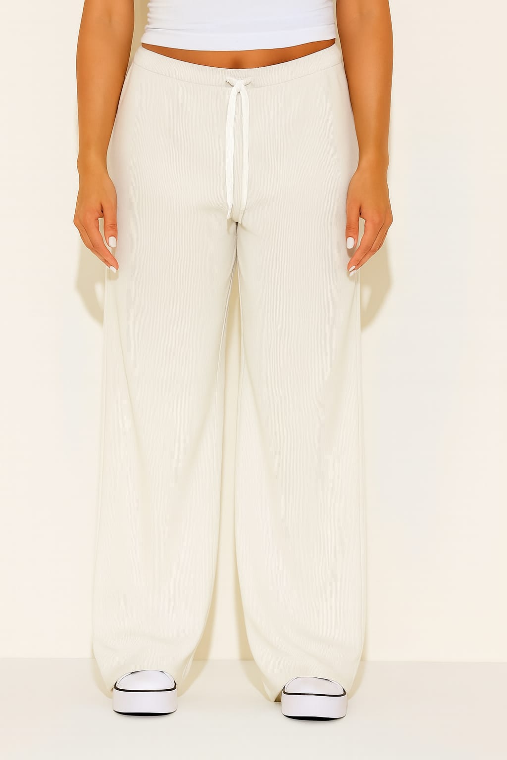 2668-Ribbed Drawsting Wide Leg Trouser For Women-Off White