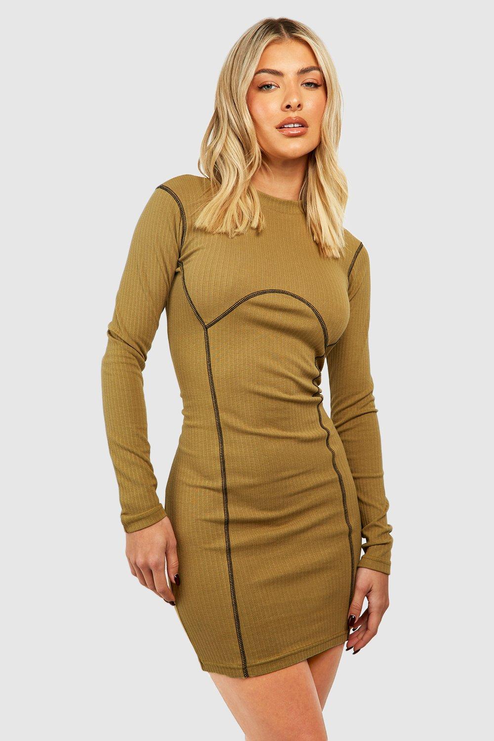Boohoo Seam Detail Long Sleeve Bodycon Dress-2341-Olive