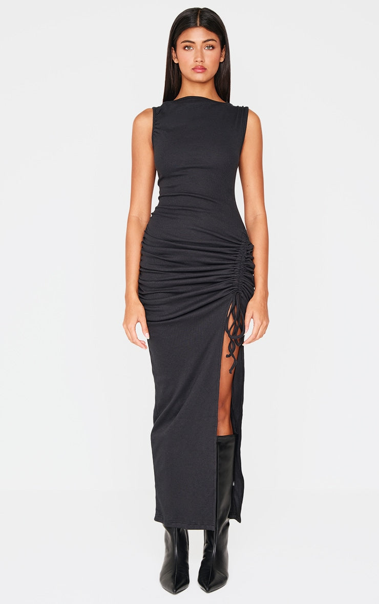 2649-Ribbed Side Split Ruched Sleeveless Maxi Dress
