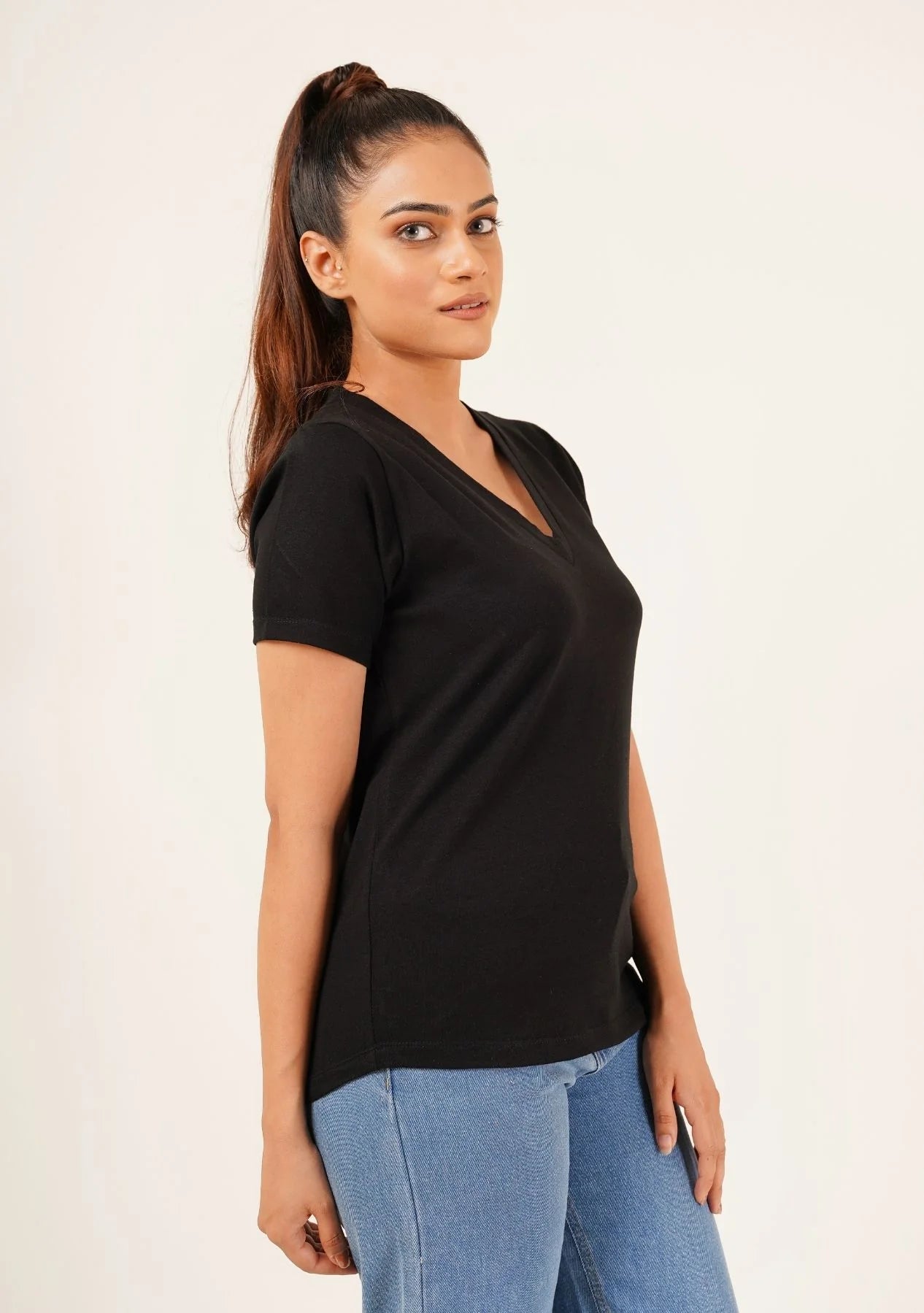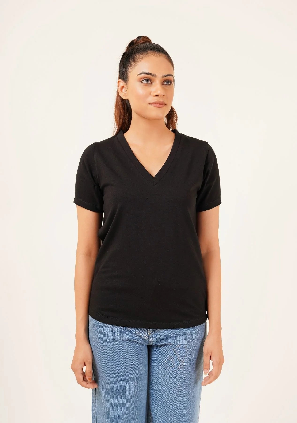 2695-Fapak V-Neck T-shirt For Women-Black