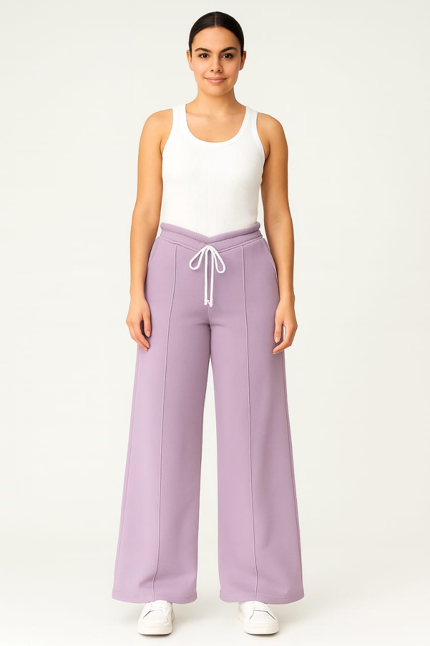 Crafted from soft fleece fabric, these trousers provide exceptional warmth and comfort for winter wear. Featuring a flattering V-shaped belt and a stylish front pleated design, they combine functionality with a tailored look. Ideal for colder seasons, they offer both insulation and a refined silhouette, making them a smart choice for women seeking cozy yet elegant winter attire.
