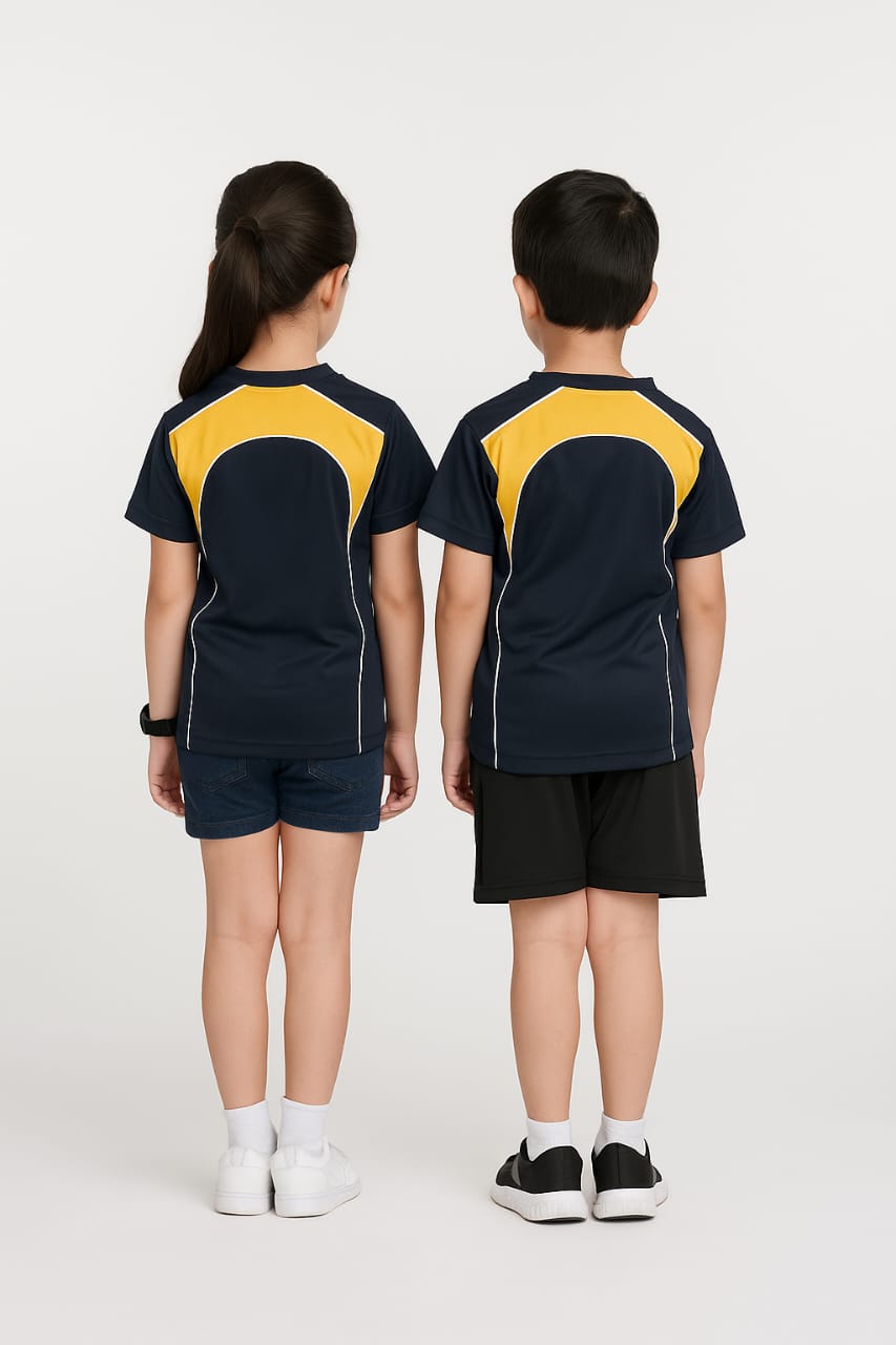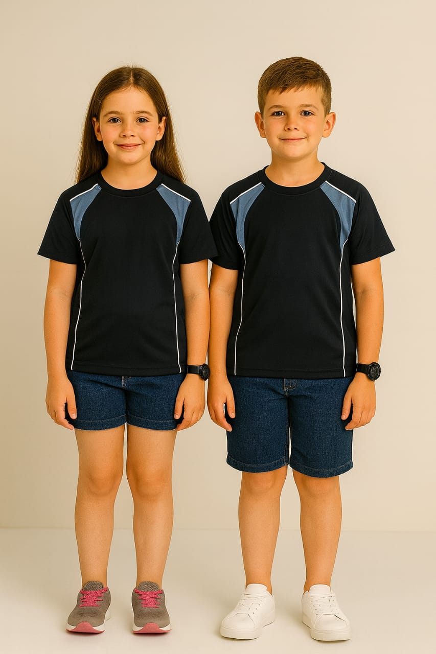 Add a bold twist to your child's summer wardrobe with the Encore T-Shirt. Featuring a classic navy body with contrast color panels, this unisex tee is made from soft, breathable micro polyester – perfect for active kids who love to move. Navy body remains the same across all color options, making it easy to mix and match with any outfit.