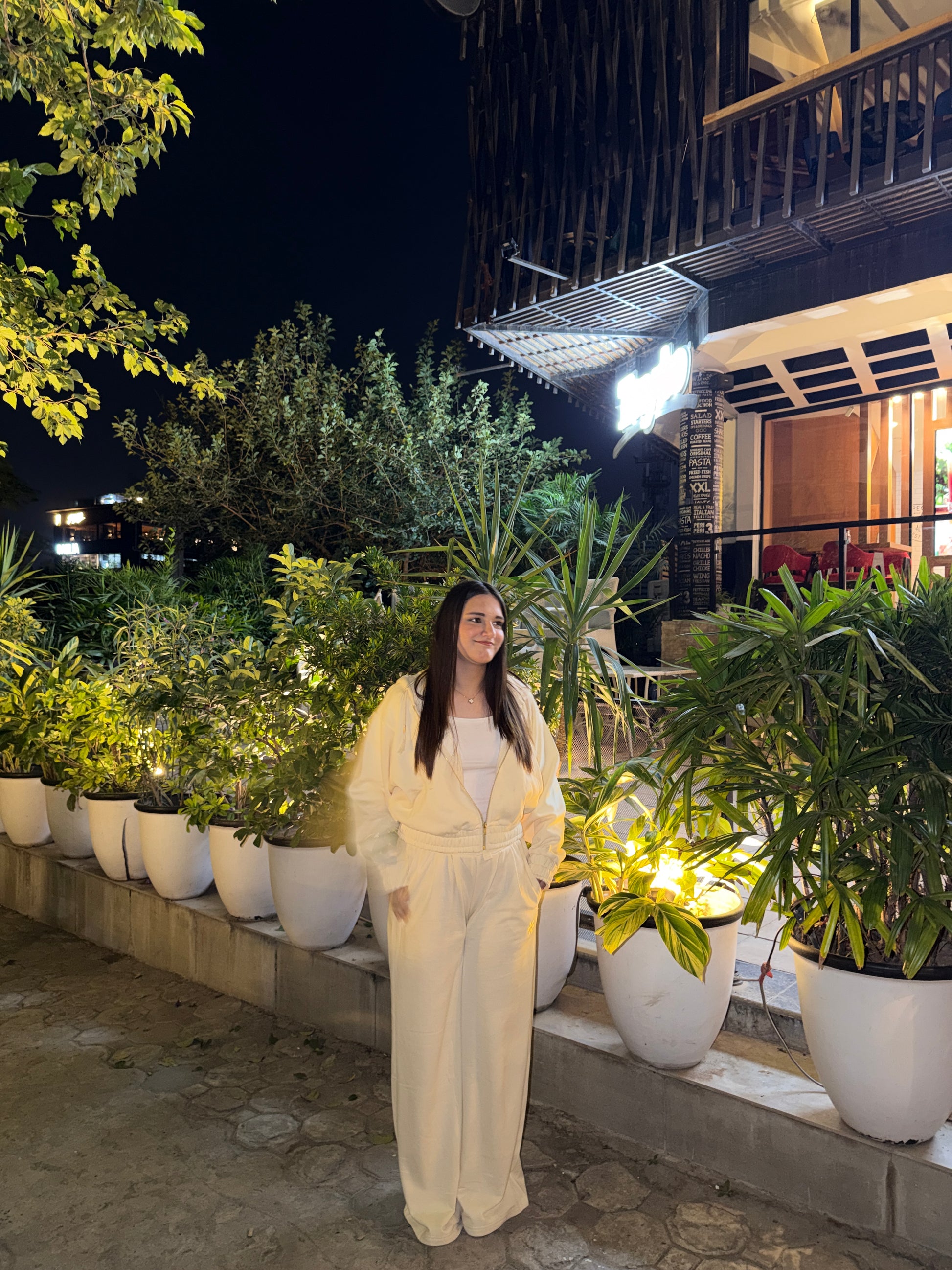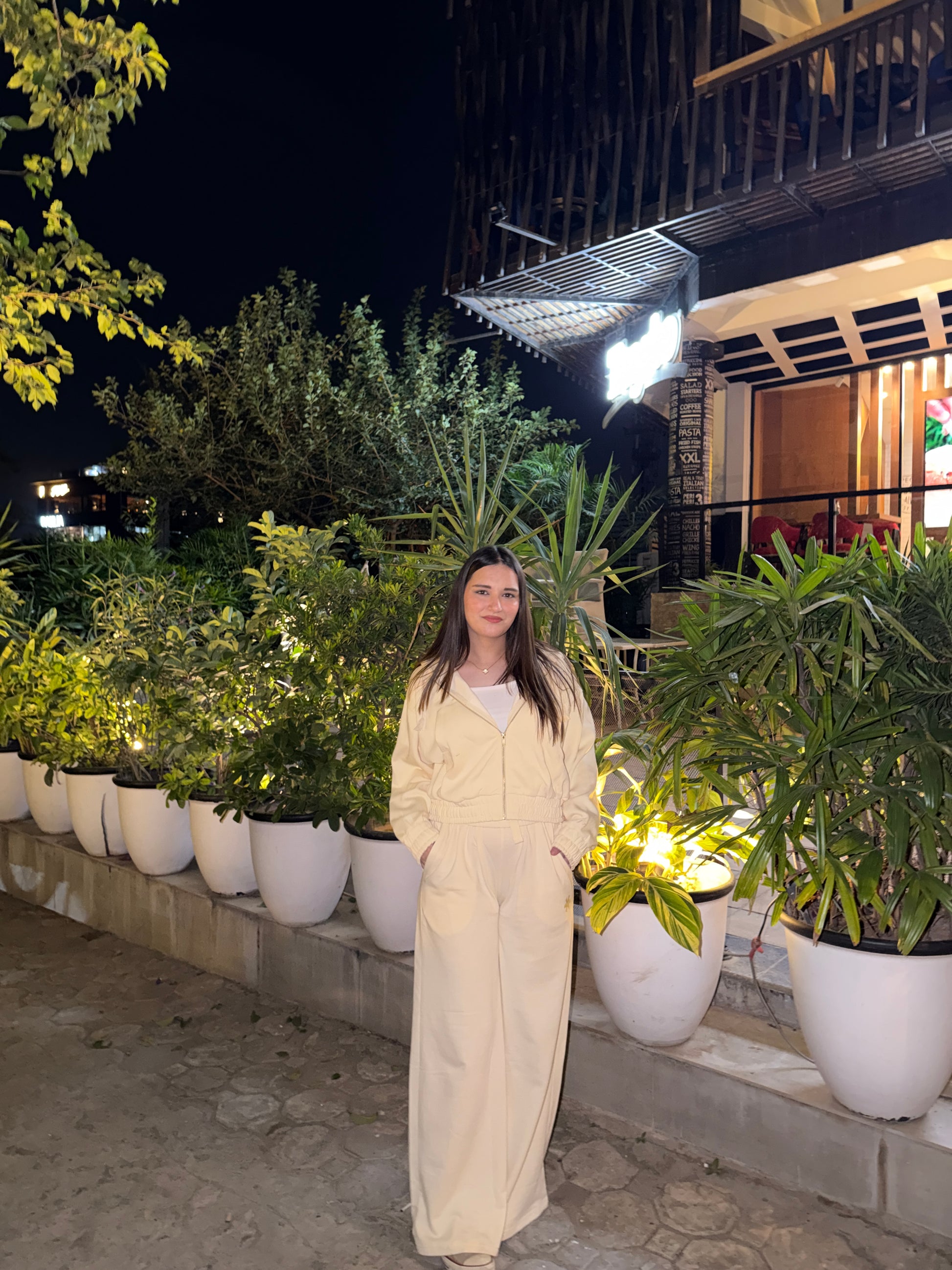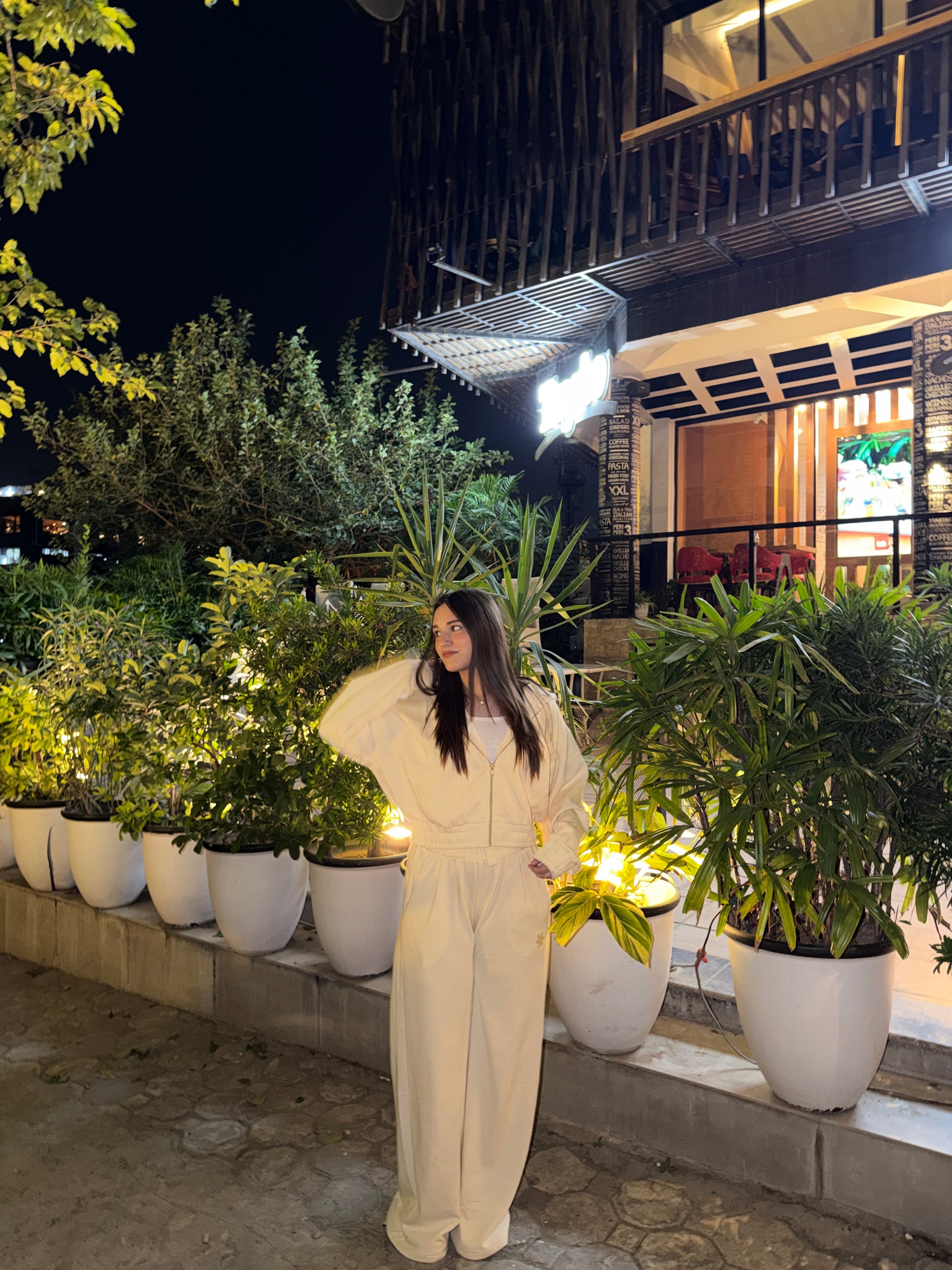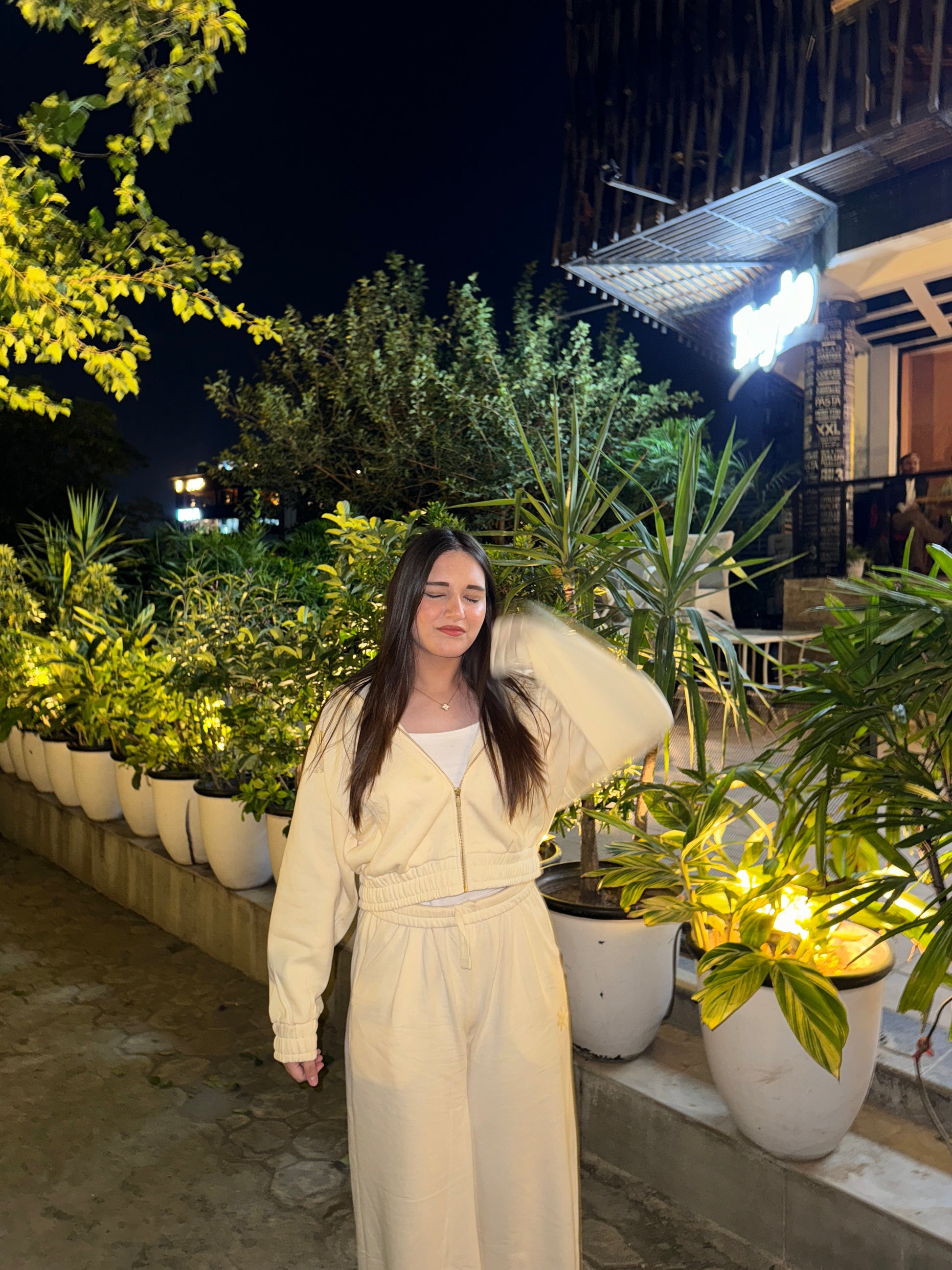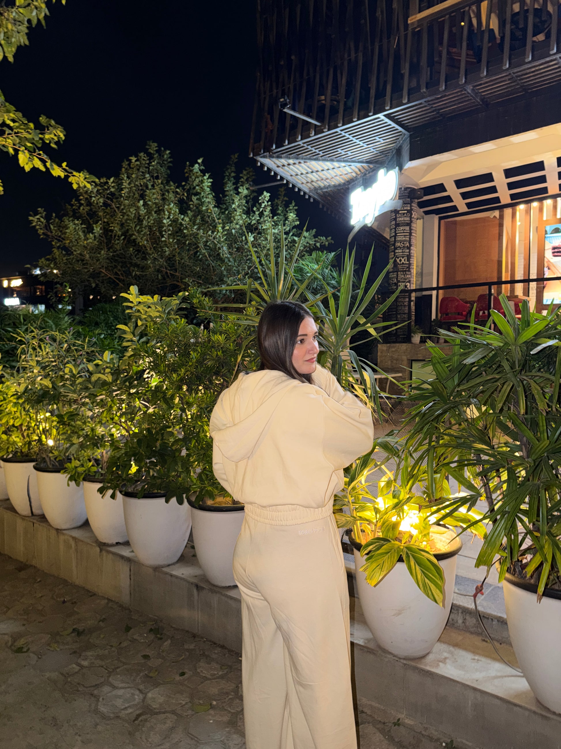 Crafted from soft, breathable fabric, this tracksuit is perfect for lounging, running errands, or stepping out in style. The neutral cream beige tone brings understated elegance to your off-duty look.