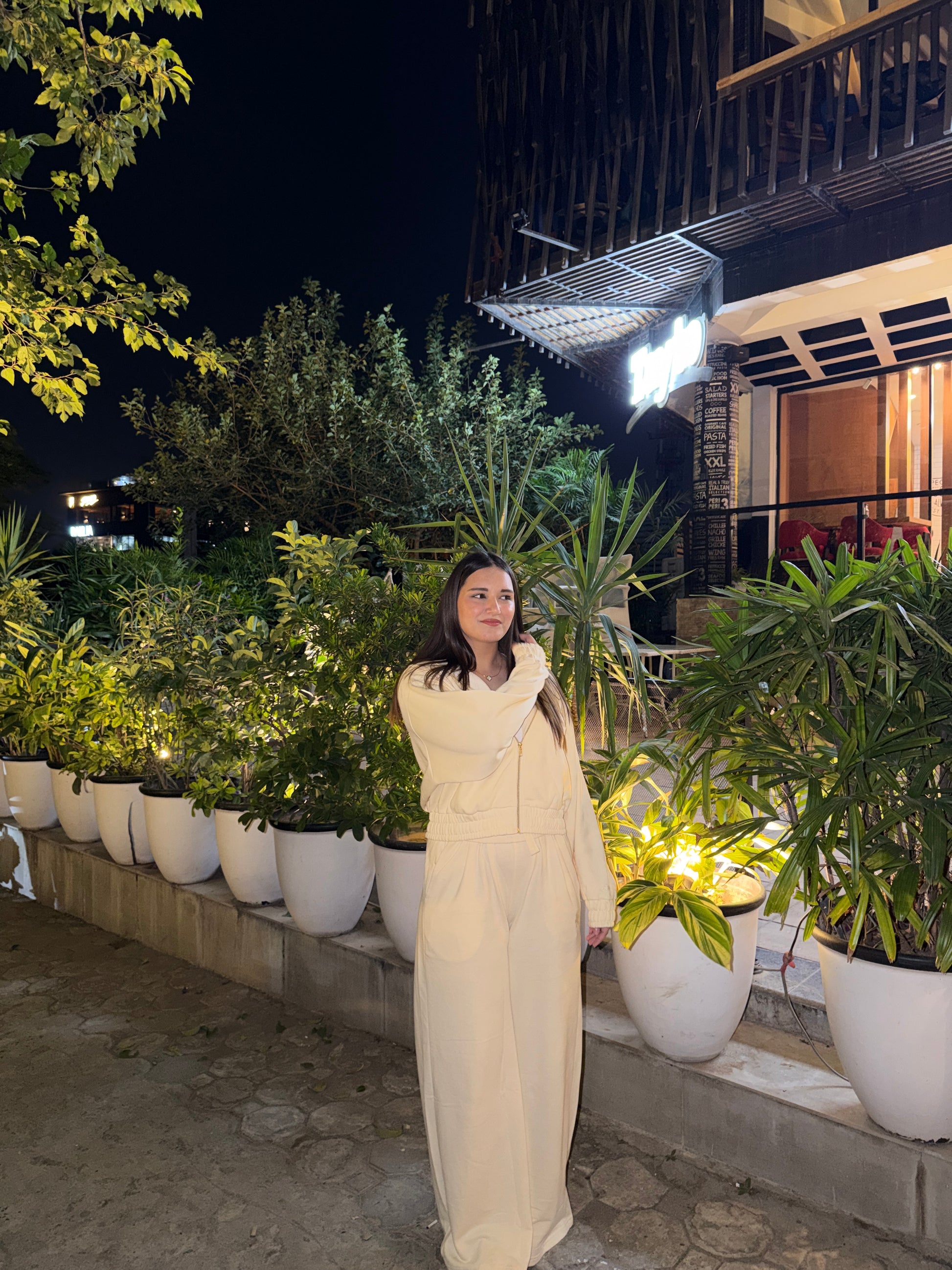 Effortlessly stylish and ultra-comfortable, the Osk Women Tracksuit in Cream Beige is your go-to for laid-back luxury. Designed with a sleek DOWN SHOULDER HOOD, it offers both functionality and flair. The wide-leg trousers add a modern twist, providing freedom of movement and a flattering silhouette.