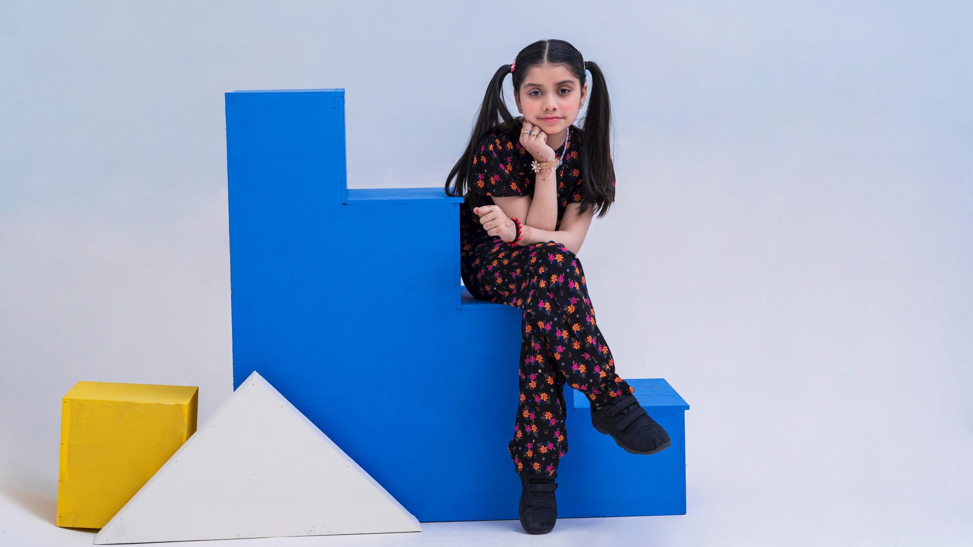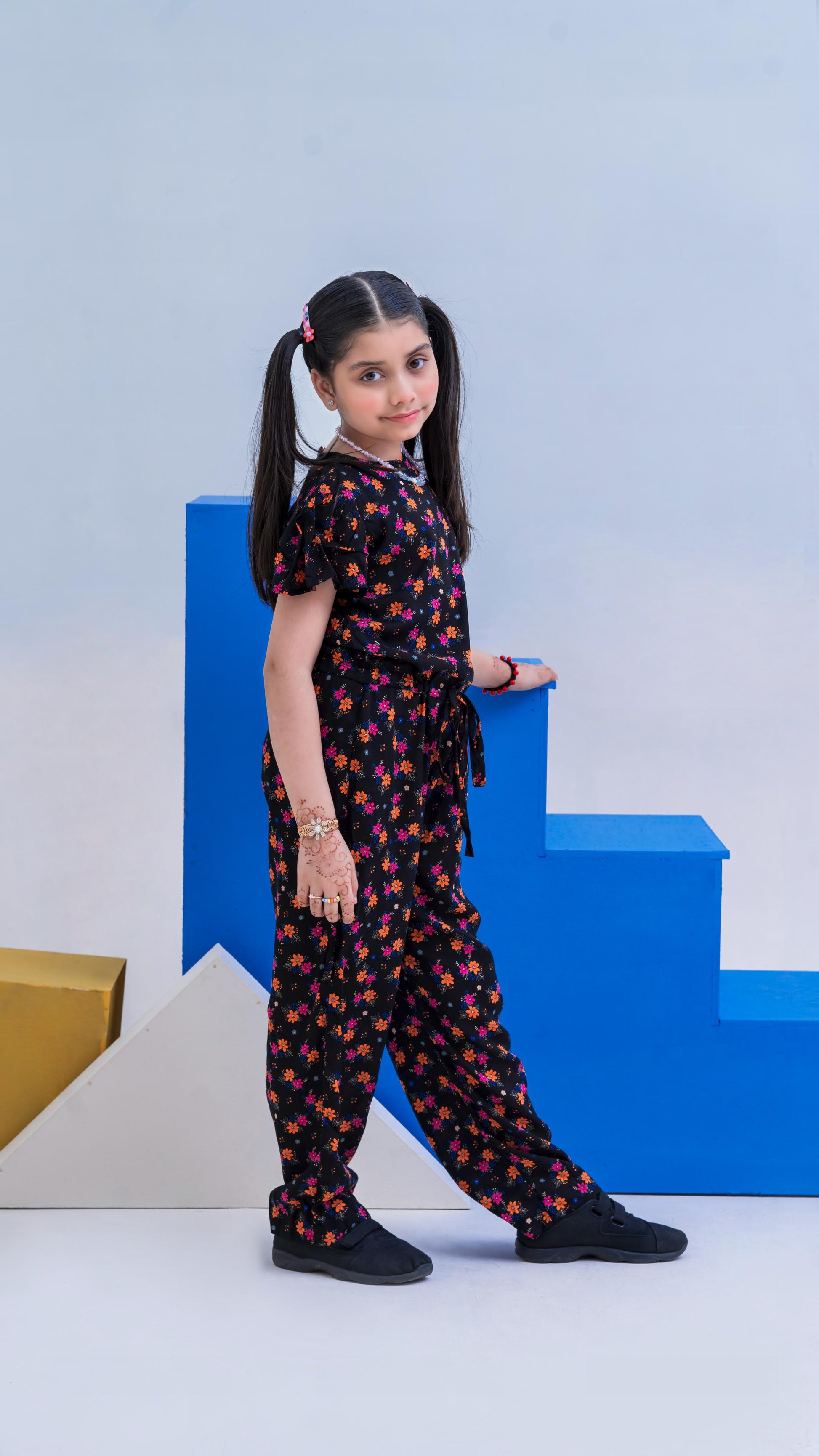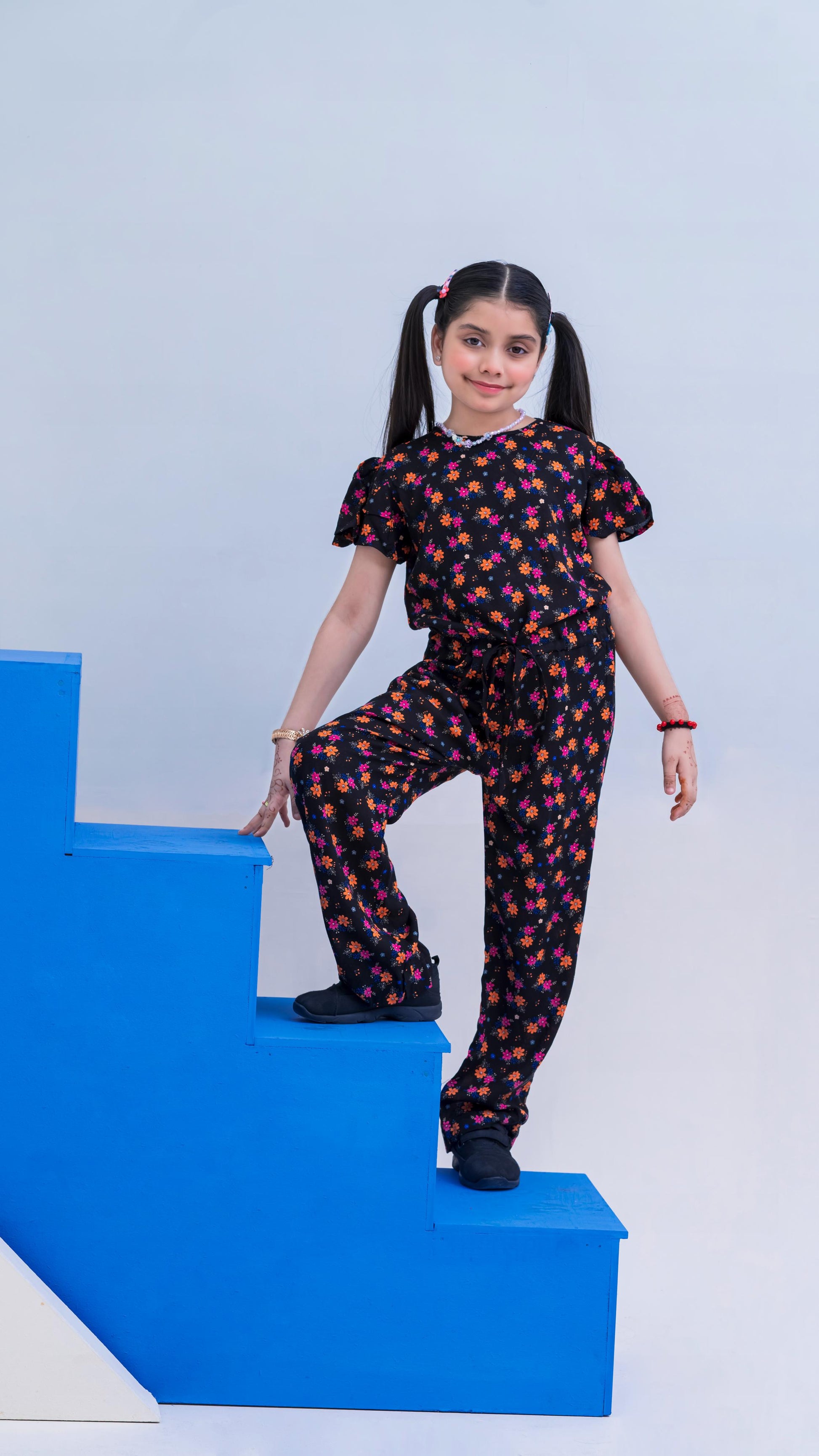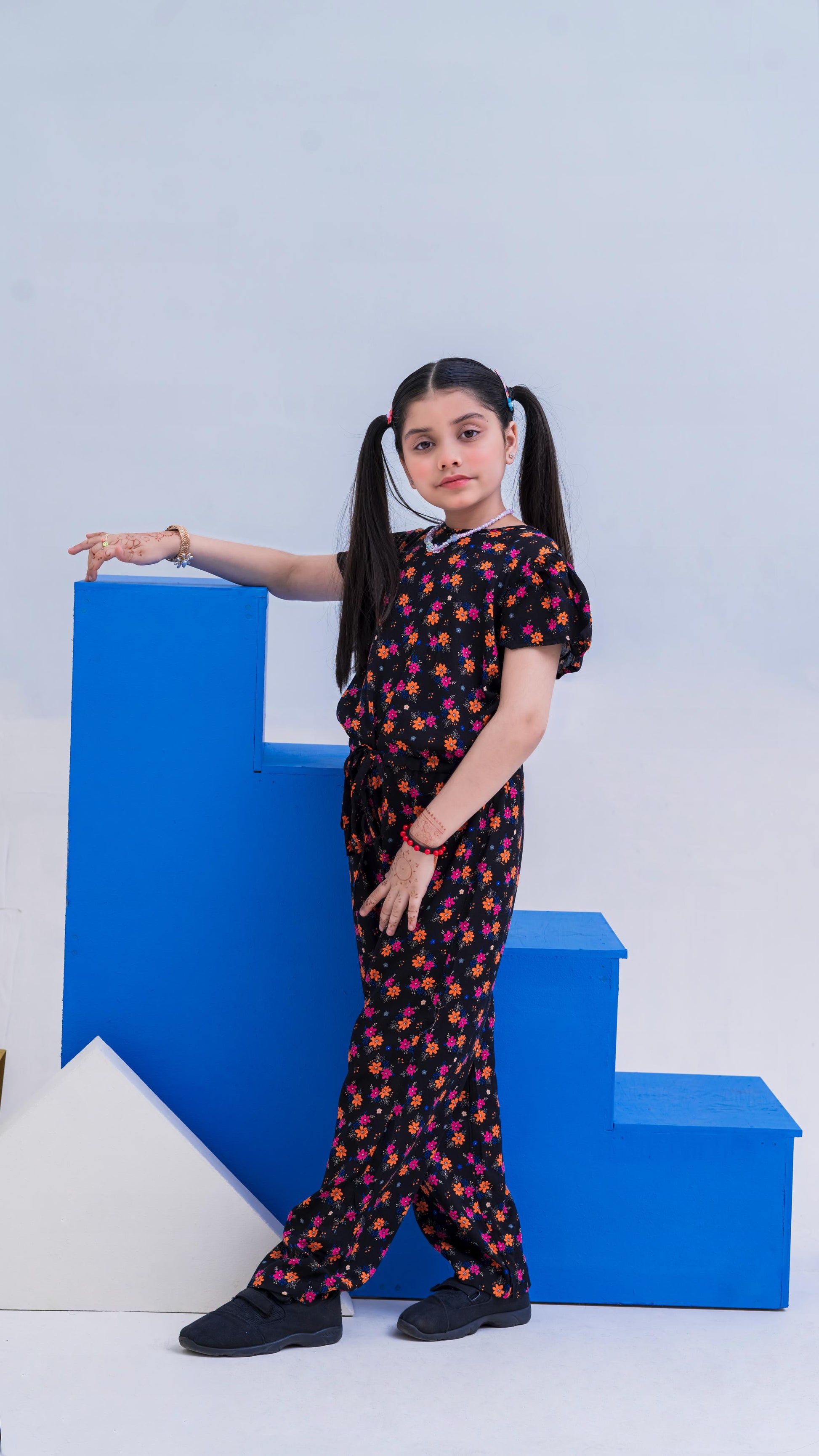 Allover Floral Print Belted Jumpsuit Girls-2397-Black