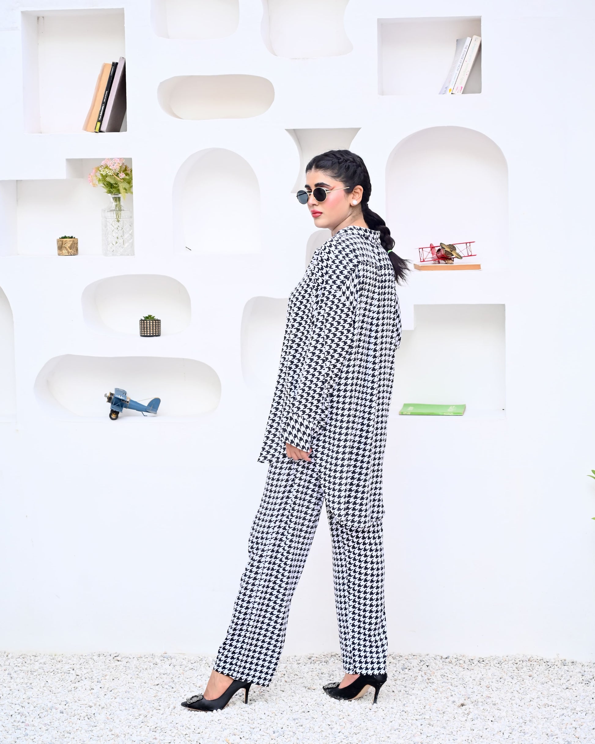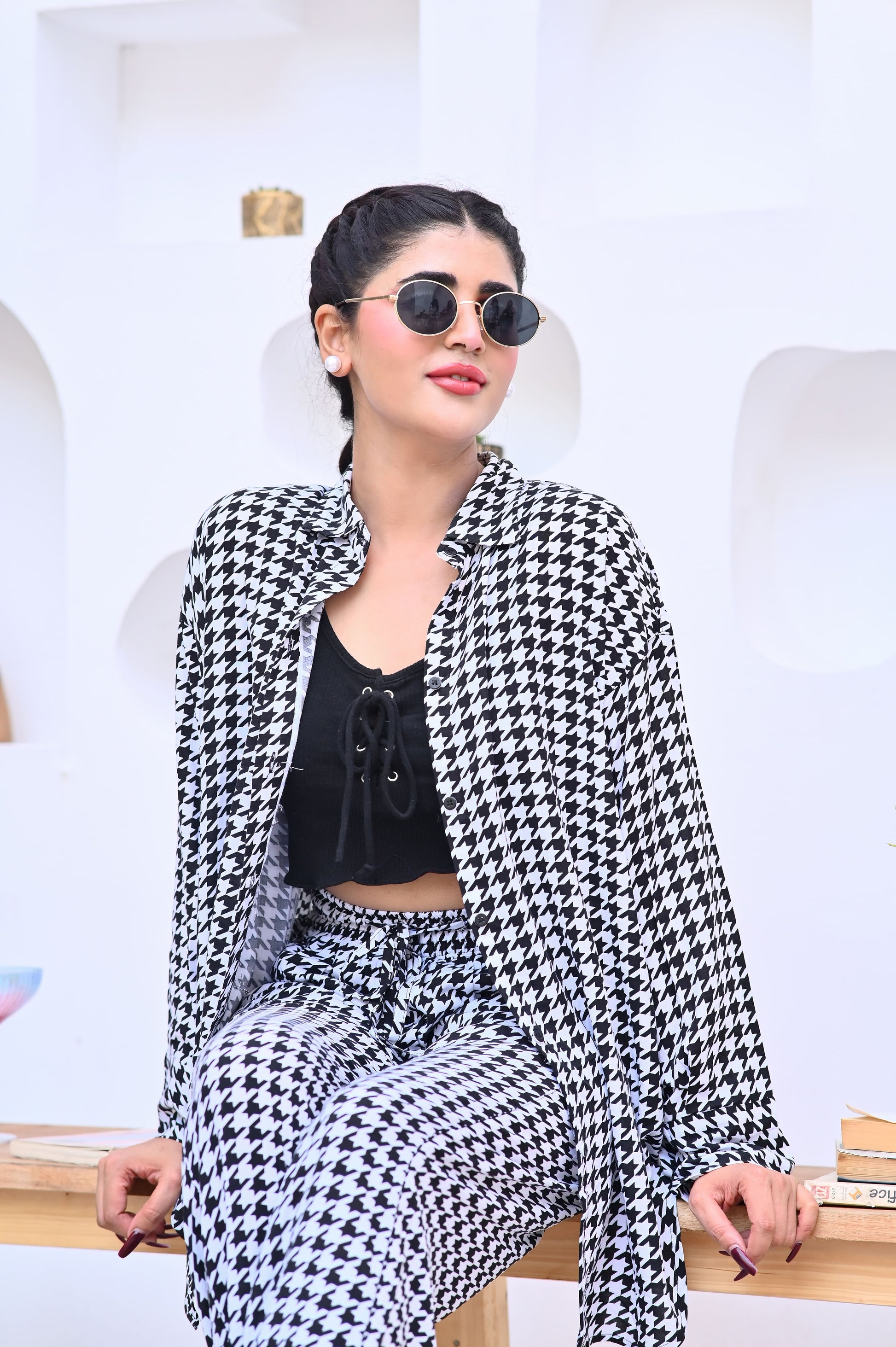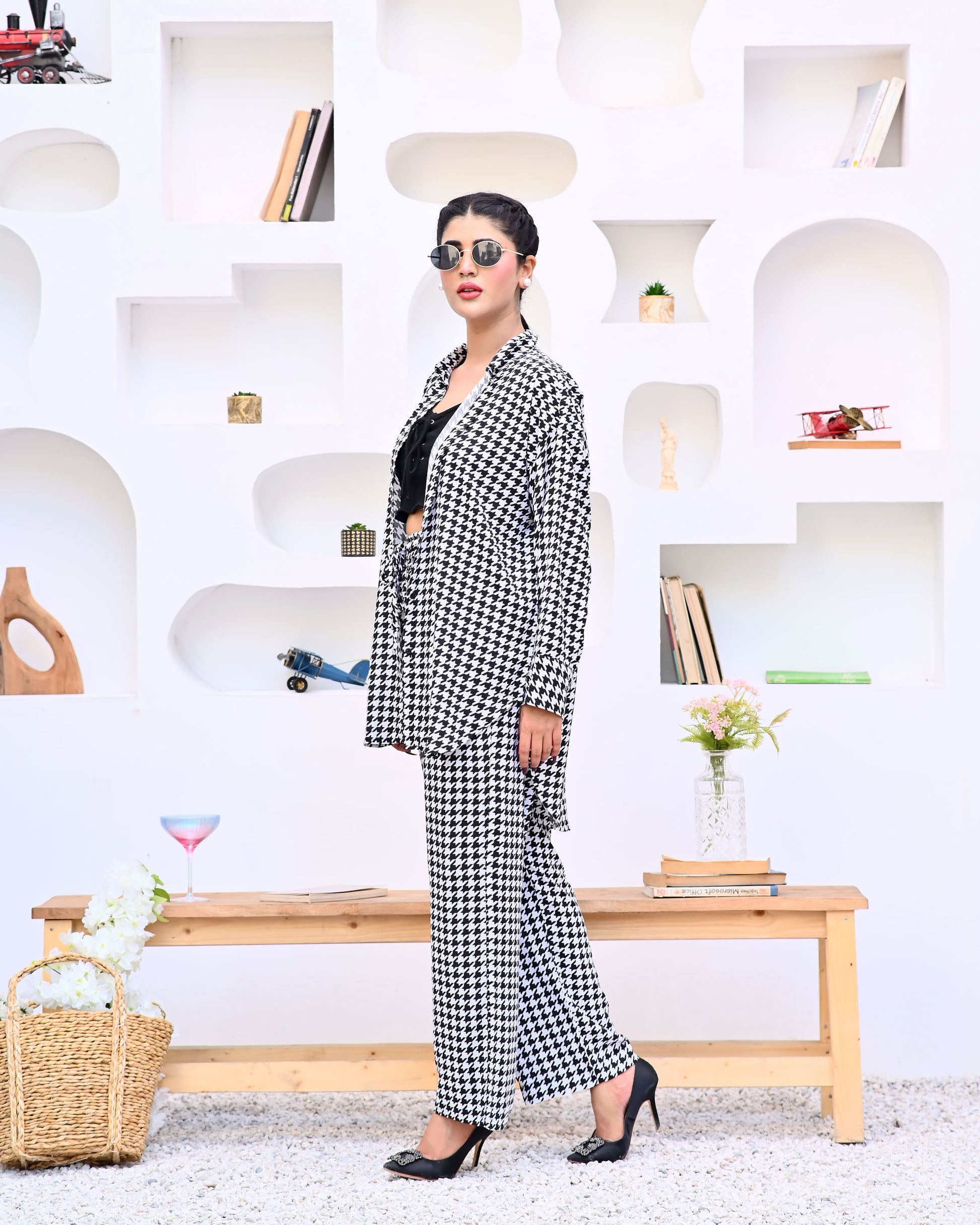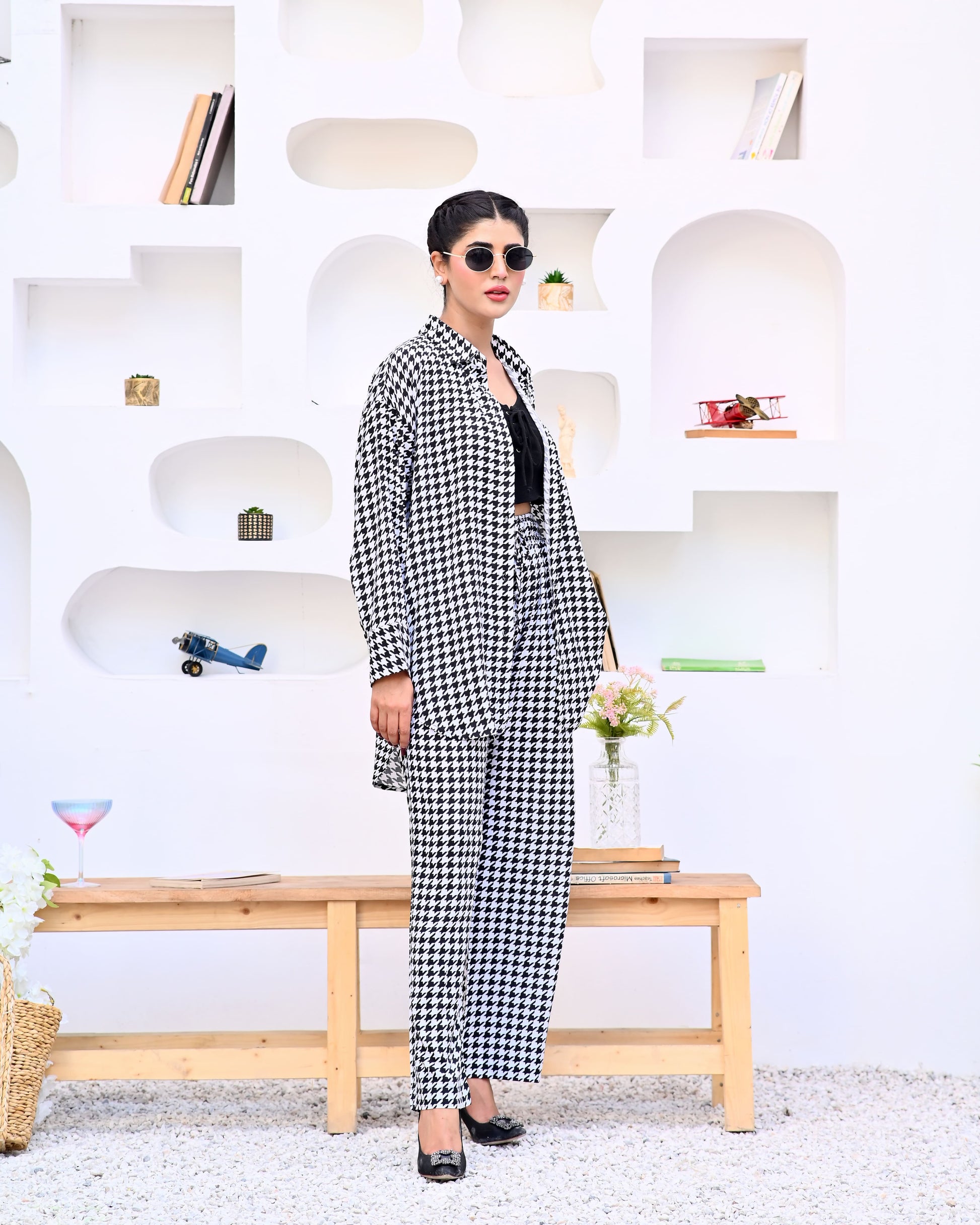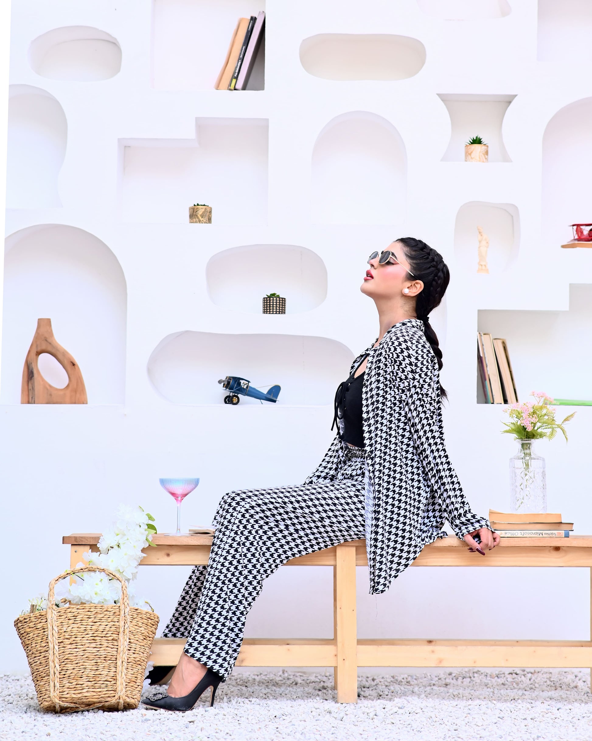 Featuring a famous hound tooth print, this set is both trendy and modern. Perfect for any fashion-forward woman, this set is a must-have addition to your wardrobe. Get ready to turn heads with this stylish and chic co-ord set.