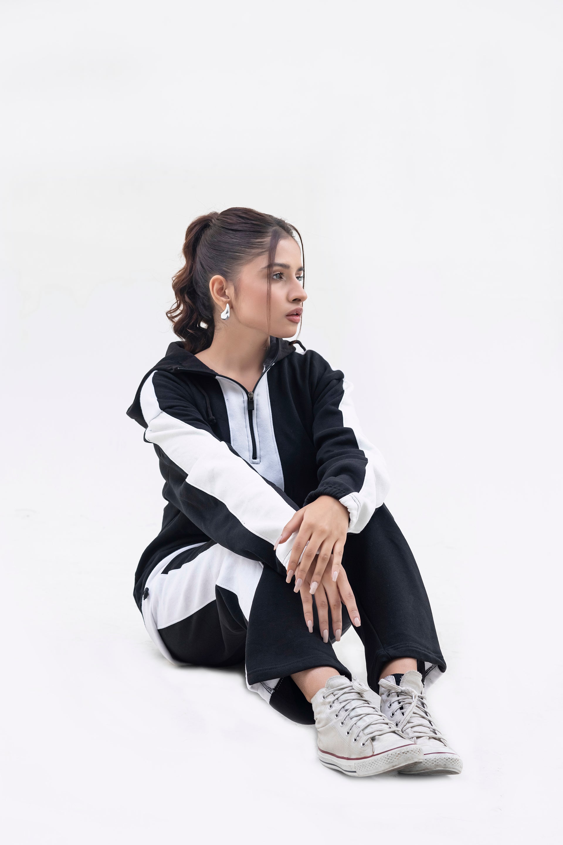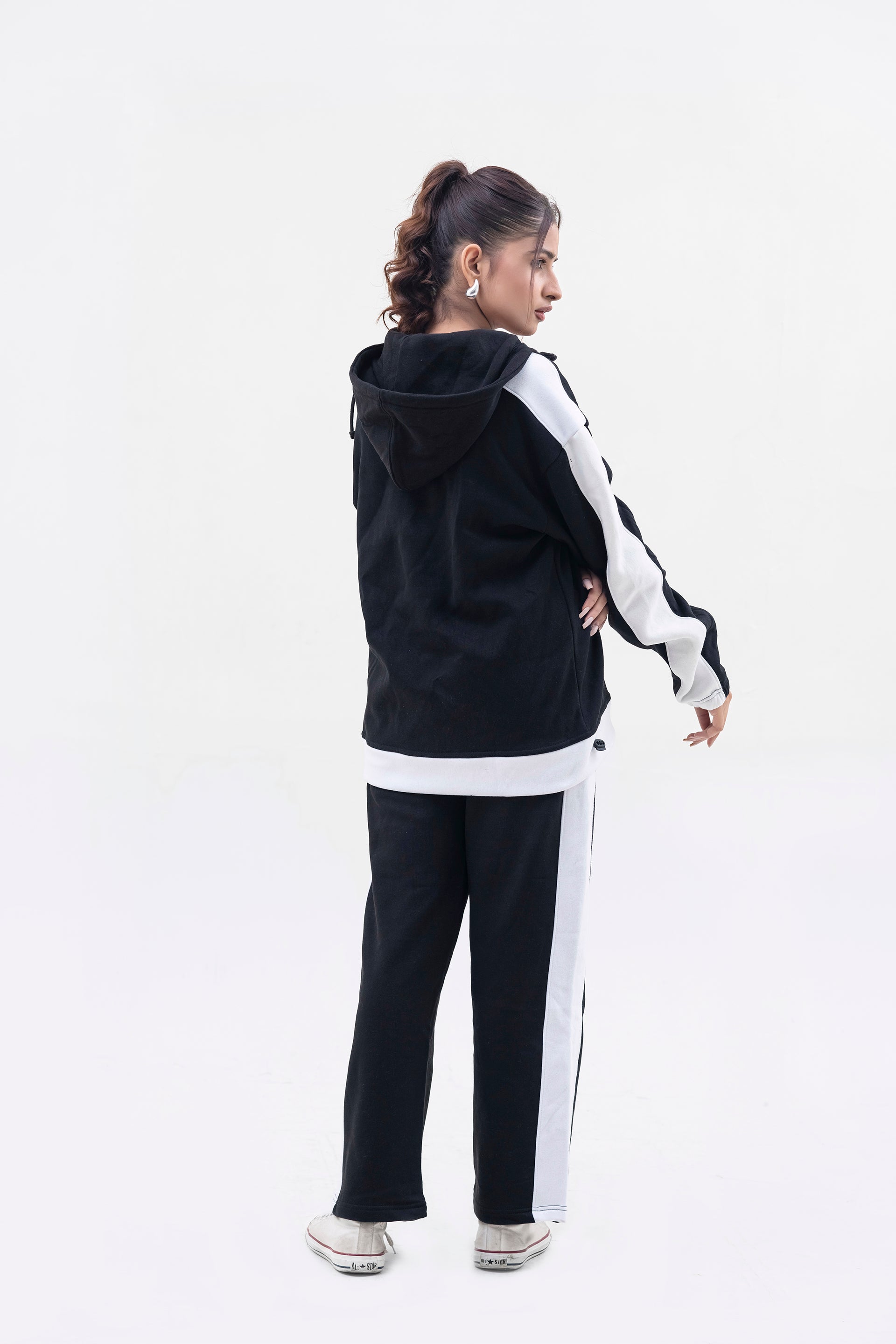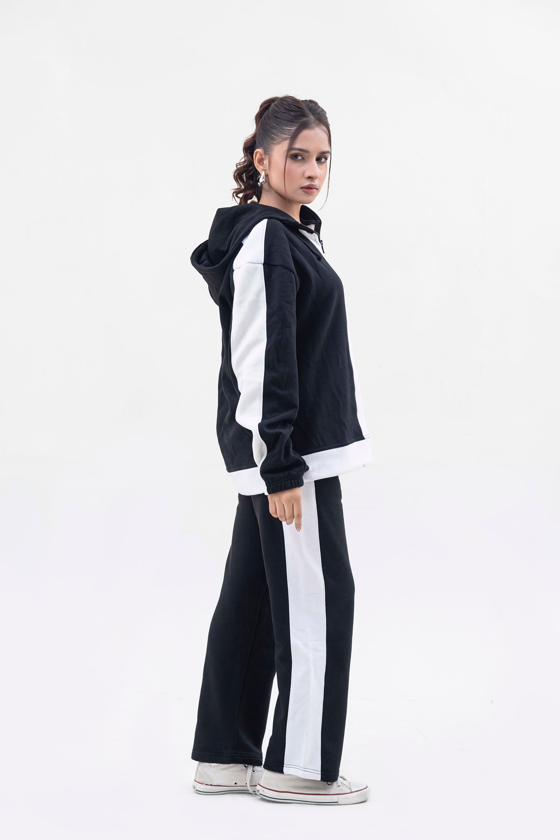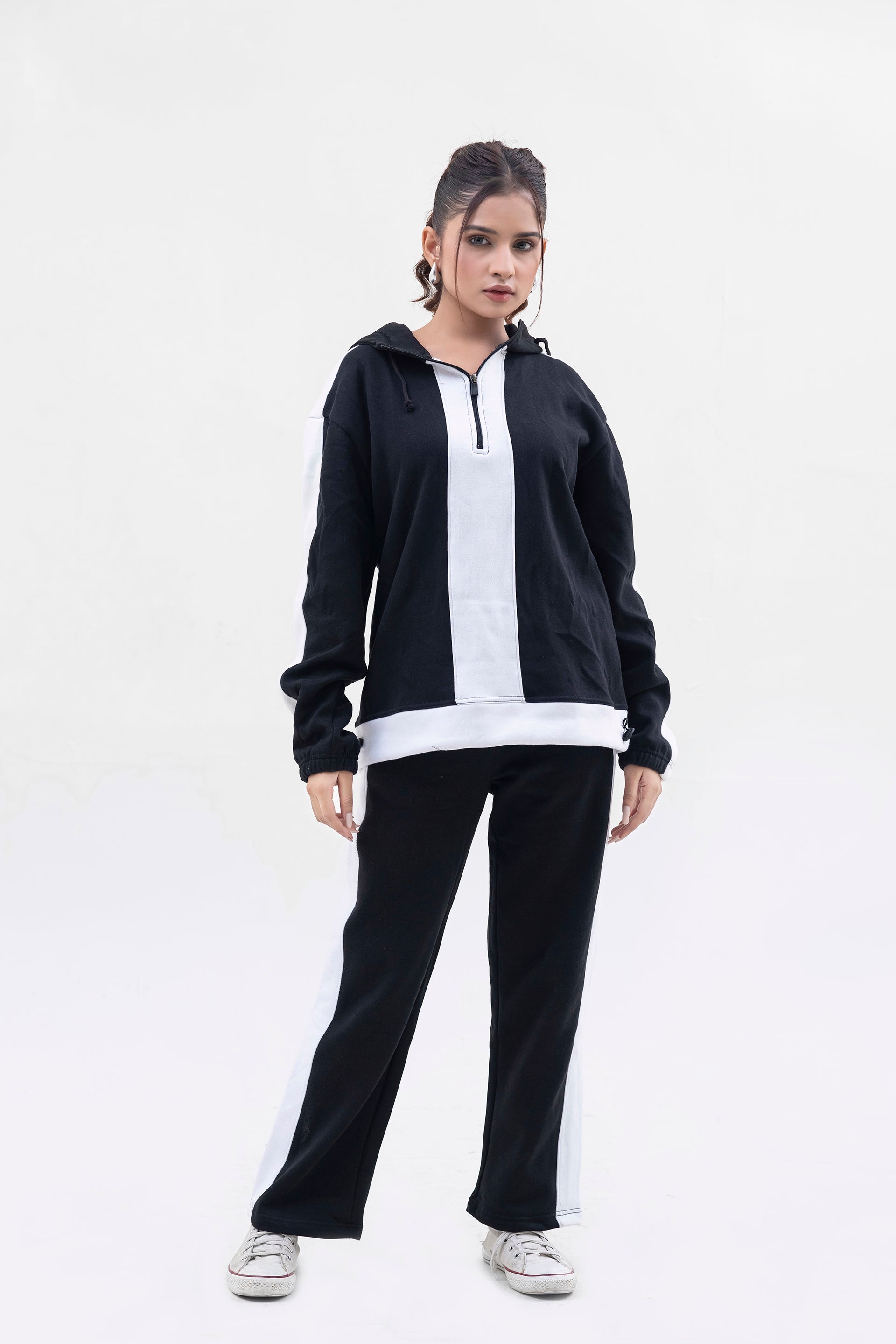 FX Quarter Zip Hood Tracksuit For Women-2583-Black White