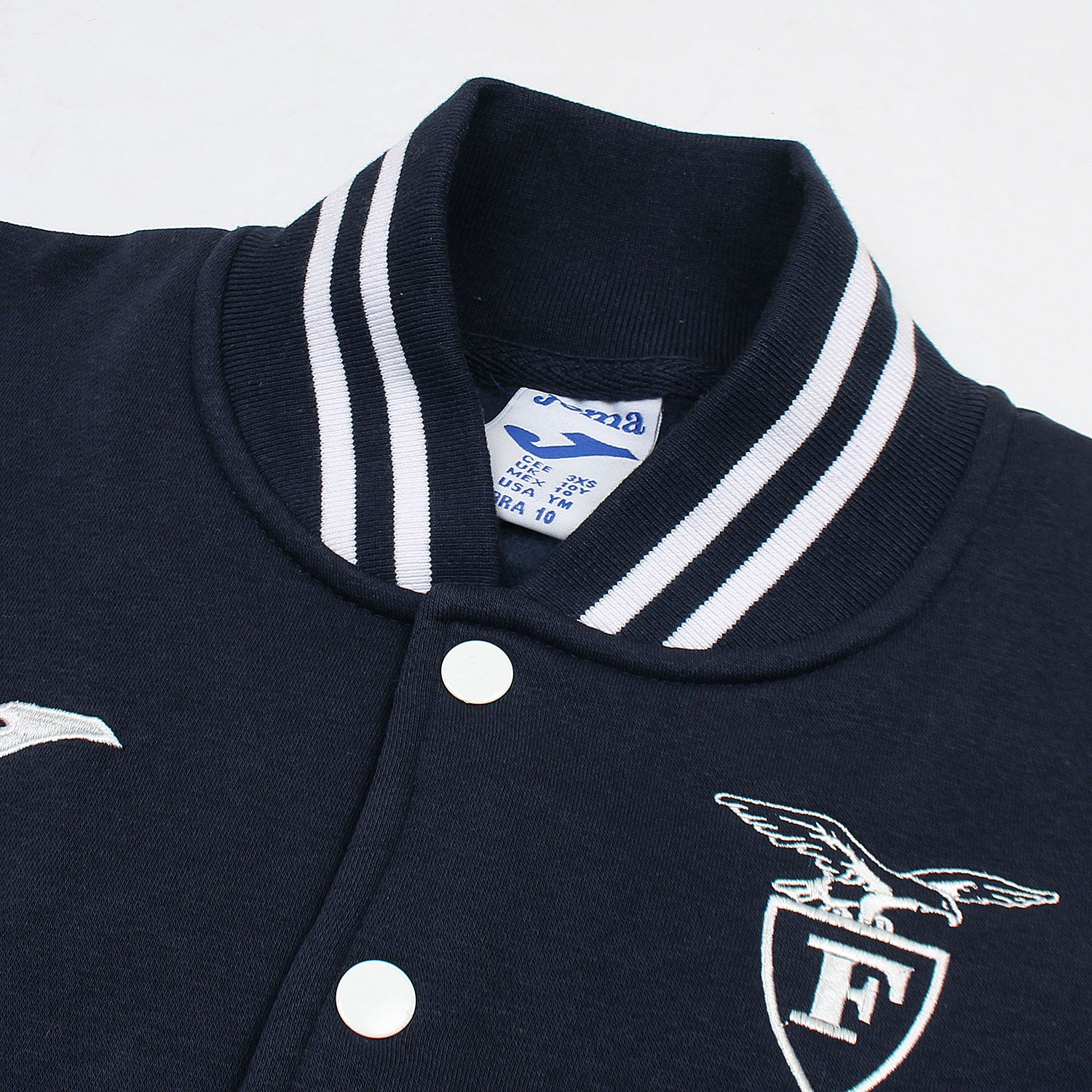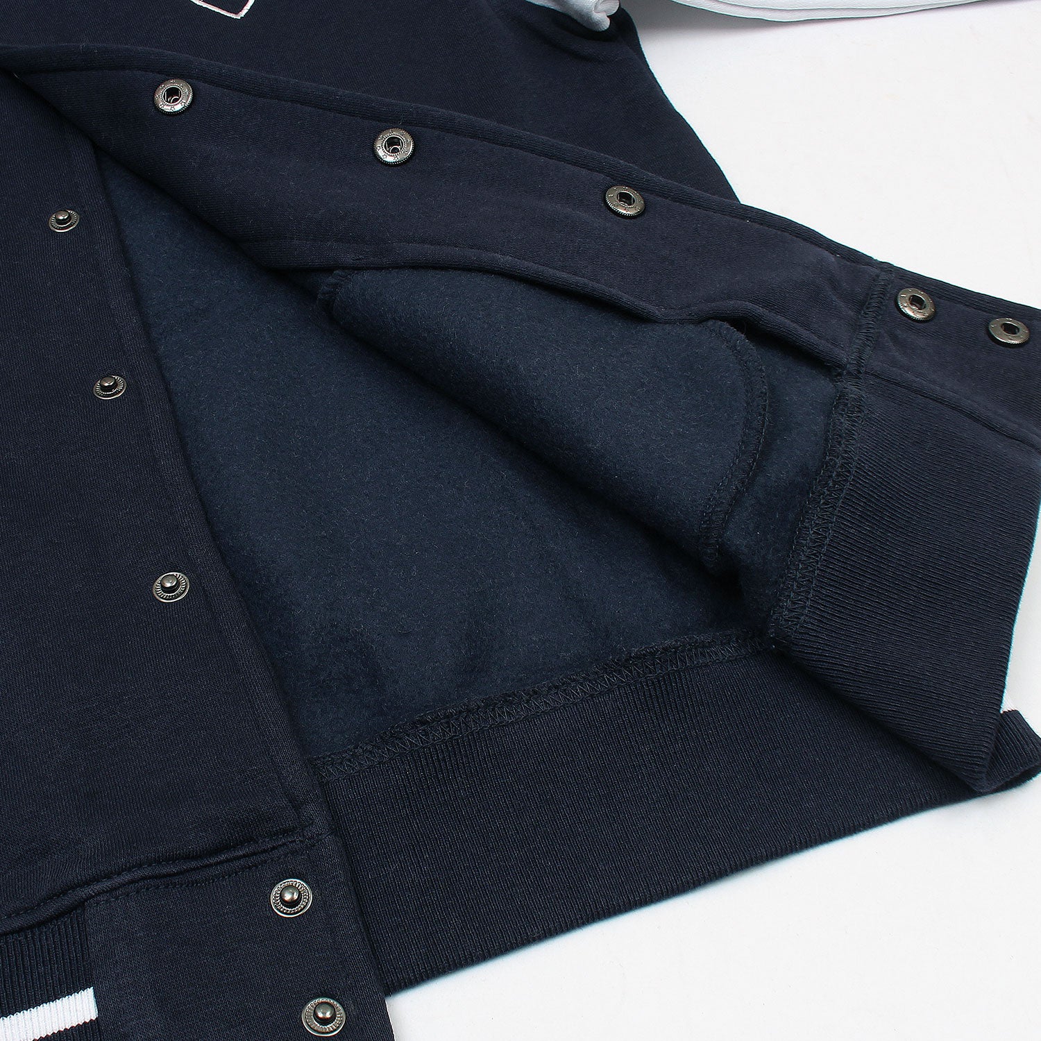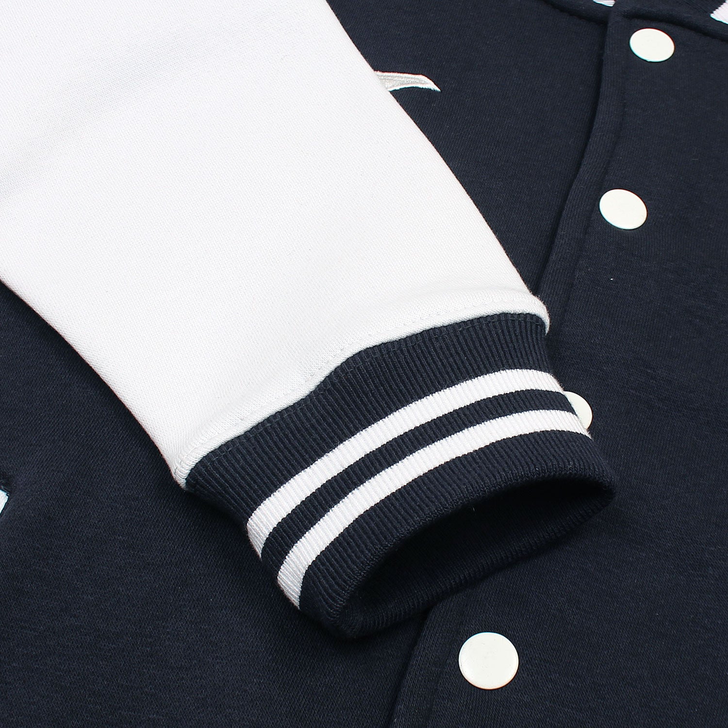 Let your little one step out in style with this trendy Kids Varsity Jacket! Designed with a timeless navy-and-white color scheme, it features a button-up front and ribbed striped cuffs, collar, and waistband for that authentic varsity look. Made from a soft and durable cotton-polyester blend, this jacket ensures comfort and long-lasting wear. The embroidered logo adds a sporty vibe, making it a standout piece for school, casual outings, or sports days. Pair it with jeans and sneakers for a cool, casual outfit. This jacket is a must-have for your kid’s wardrobe!!