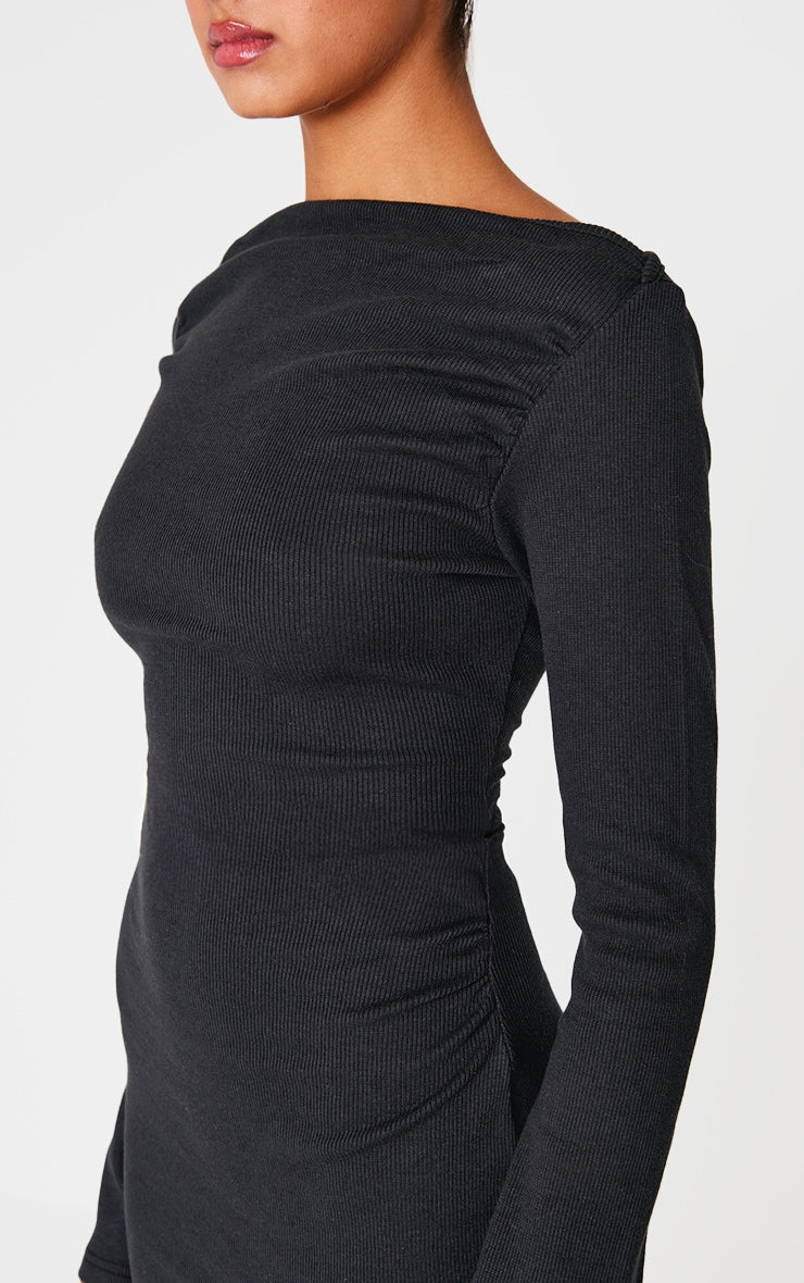 Work your styling techniques to make this black ribbed ruched detail flare sleeve mini dress perfect for any occasion. Brought to you in a black ribbed material with ruched detailing and long flare sleeves, what's not to love? Just add knee length boots and a mini bag for a look that is sure to have all eyes on you.
